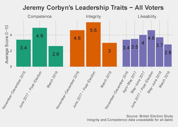 Indeed, Corbyn has been rated more highly for his integrity than his other traits in the past. In late 2016 his integrity rating was 4.6, a full point higher than his competence score of 3.4. But evaluations of his integrity have dramatically declined since June 2017. His integrity rating in March 2019 was only 2.6. This is not the ideal public image for a leader trying to appeal to establish a “new kind of politics”.