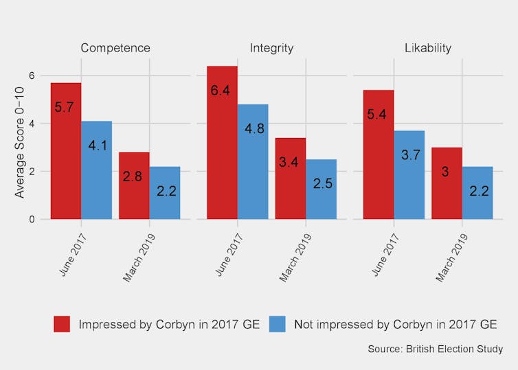 Even voters who were impressed by Corbyn’s campaign in 2017 are losing enthusiasm. This group gave him a 5.7 for competence in June 2017 but only 2.8 in March 2019. His likeability rating among this group has dropped from 5.4 to 3. Corbyn will have to re-convince the same voters all over again that he is a capable leader.