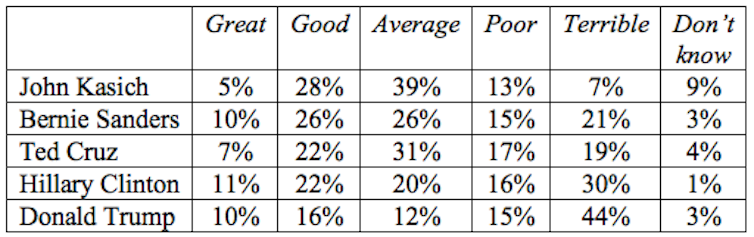 It just so happens that a similar question – “What kind of president do you think each of the following would be – a great, good, average, poor or terrible president?” was asked by Pew Research Center in March 2016. According to the results, we can then rank Democratic and Republican primary candidates.