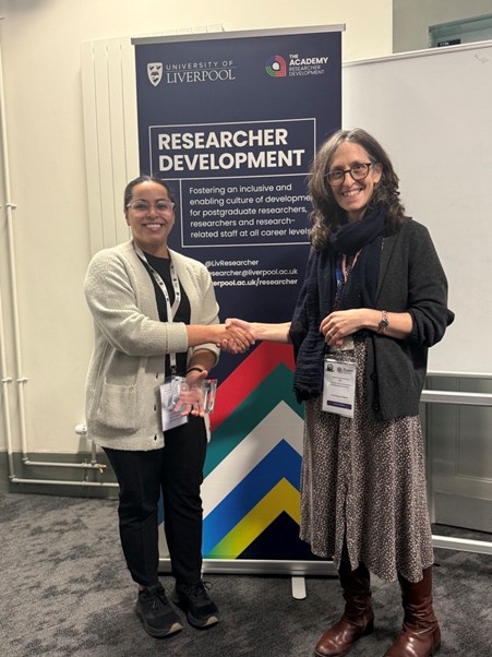 The 2025 Research Staff Community Champion Prize was awarded to Dr Haifa Alhadyian of the Institute of Systems, Molecular & Integrative Biology. Dr Alhadyian has developed tailored resources to empower graduate students and postdocs to manage their career progression and has created resources to engage school students with science. She is also the founder of a podcast series fostering scientific collaborations and strengthening research culture within Arab societies.