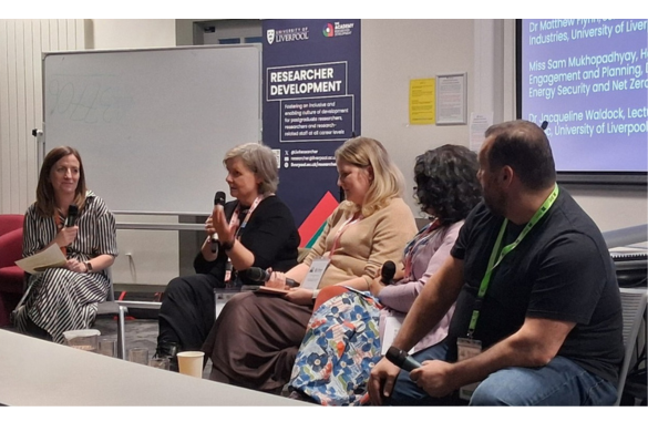 Image: Dr Selina Johnson chairs the panel on building interdisciplinary collaborations, featuring Prof Michelle Briggs, Dr Jacqueline Waldock, Sam Mukhopadhyay and Dr Matthew Flynn.