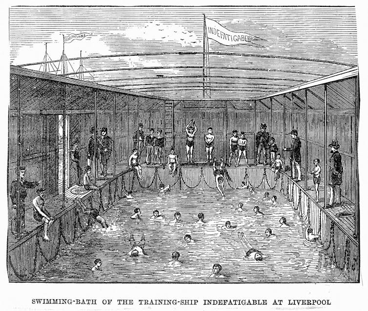 A swimming bath on the training ship Indefatigable, moored in the Mersey.
